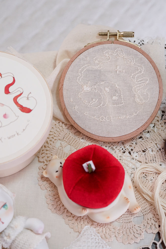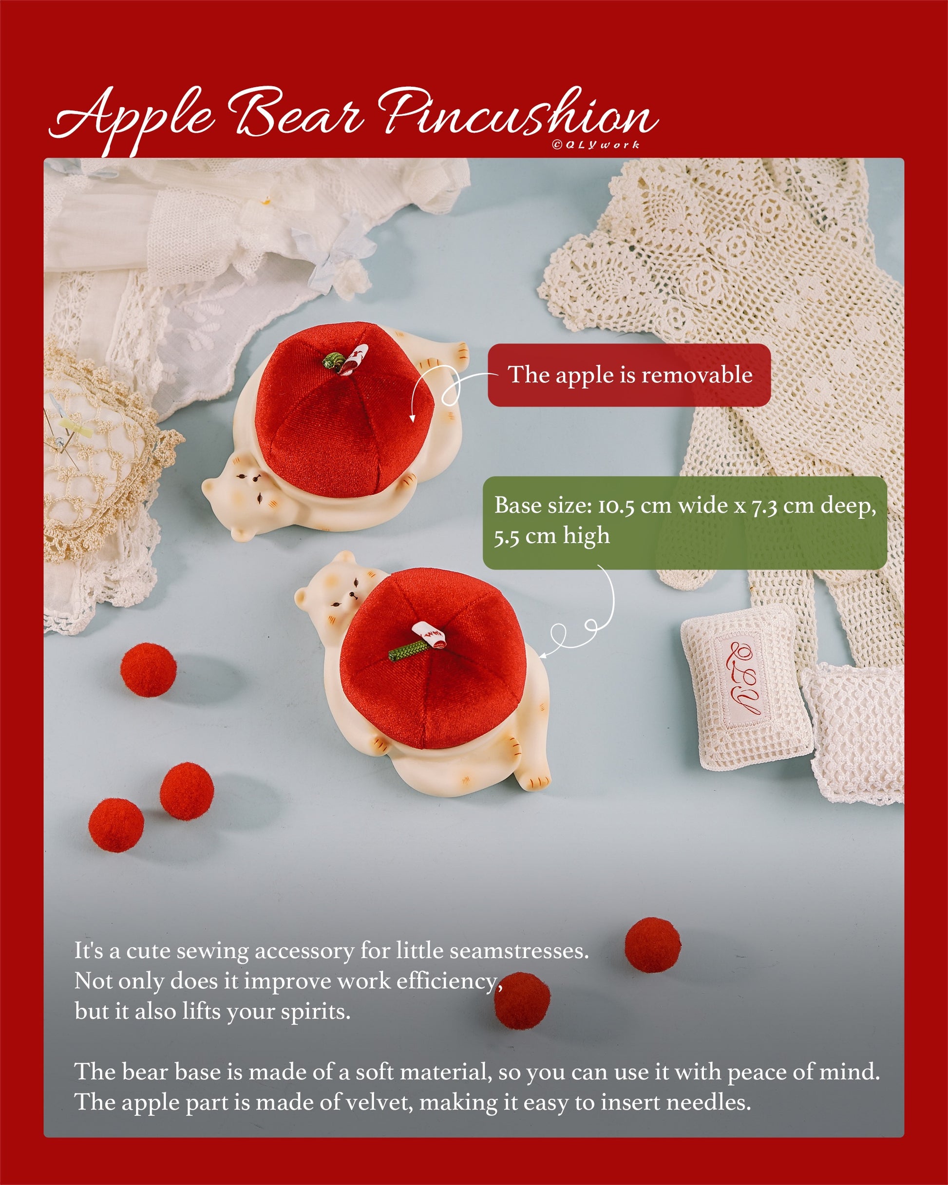 The bear base is made of a soft material, so you can use it with peace of mind. The apple part is made of velvet, making it easy to insert needles.